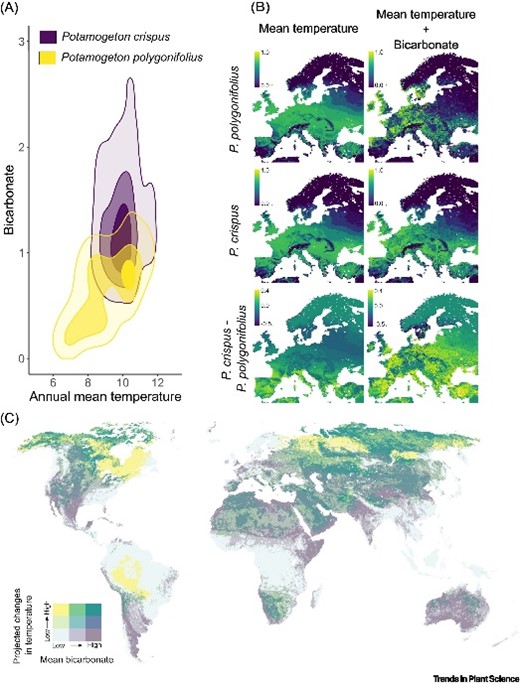 ?。?)通過對兩種常見眼子菜屬植物的生態位模擬研究發現,未來氣候變化所導致的溫度和水體碳酸氫根濃度變化,對菹草和蓼葉眼子菜的環境適合度及其分布格局具有非對稱影響,這充分表明全球變化對于水生植物乃至水生生態系統影響的復雜性。