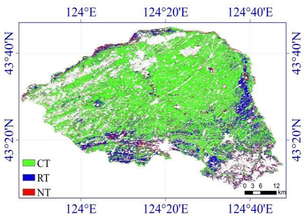 保護性耕作可以減少水土流失、保持乃至增高土壤有機質含量,并使黑土退化的現象得到有效的遏制。環(huán)保技術信息中心(CTIC)將秸稈覆蓋度大于30%的耕作稱為免耕(NT),15%–30%的稱為少耕(RT),秸稈覆蓋度為0-15%被稱為傳統耕作(CT)。秸稈覆蓋度是保護性耕作識別的重要判別依據。遙感技術可以大范圍、快速、動態(tài)、客觀地獲得秸稈覆蓋信息,有效彌補地面監(jiān)測空間不連續(xù)和以點帶面的不足。然而,現階段可用的光學影像雖較為豐富,但是在特定區(qū)域特定時間內進行秸稈覆蓋遙感動態(tài)變化監(jiān)測研究時由于云雨影響,高時空分辨率的數據少之又少。中國科學院東北地理所研究人員基于MODIS和Sentinel-2遙感數據通過改進型時空自適應反射率模型(Enhanced Spatial and Temporal Adaptive Reference Fusion Model, ESTARFM)模型預測出所需日期的耕作指數。在此基礎上,利用玉米秸稈覆蓋度(MRC)和耕作指數之間的經驗模型估算出研究區(qū)內的MRC,以MRC為判別標準,識別研究區(qū)內的保護性耕作區(qū)域。該方法為保護性耕作遙感監(jiān)測研究提供了更多可用的秸稈覆蓋時空信息,為農業(yè)部門開展黑土地保護工作提供基礎數據和方法支撐。
