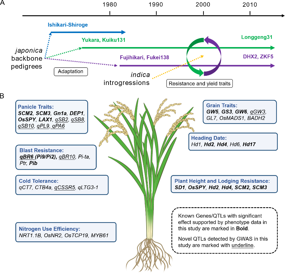研究團隊收集了涵蓋東北稻區(qū)自1940年代到2010年代選育或引種的546份水稻品種資源,進行了重測序和22個農(nóng)藝性狀表型的調查。研究發(fā)現(xiàn)東北地區(qū)水稻品種可歸類到3個具有不同進化特征的亞群(圖1),以石狩白毛為骨干的K3G1亞群在上世紀80年代前的黑龍江品種中占主導地位,隨后被以蝦夷和空育131為骨干的K3G2亞群取代;而以富士光和藤系138為骨干的K3G3亞群主要分布在遼寧和吉林,但隨著時間推移,其在黑龍江省的占比也越來越高。同時確認了秈稻滲入對東北水稻稻瘟病抗性和穗部性狀的重要貢獻。將品種選育印記追溯到123個已知或新檢測到的QTL位點以及大量秈稻滲入片段,系統(tǒng)總結了一些具有年代特征的關鍵性QTL位點或滲入片段,為后繼的品種設計選育提供了依據(jù)(圖1)。