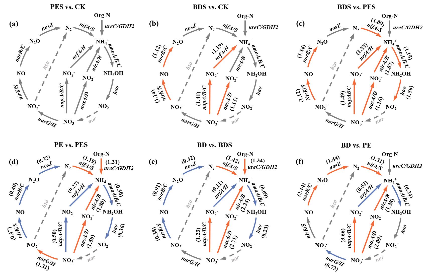 研究表面,培養(yǎng)結(jié)束時BMP的比表面積、孔容孔徑均明顯大于PE-MP,同時BMP表面可發(fā)現(xiàn)大量微生物附著。BMP殘留而不是PE-MP顯著改變土壤氮循環(huán)相關(guān)功能微生物群落。微塑料圈中氮代謝功能類群與土壤中也存在顯著分異,微塑料圈促進了氮降解、氮固定和同化硝酸鹽還原過程,但抑制了硝化和反硝化過程,其中BMP微塑料圈引起更為顯著的改變(圖1)。