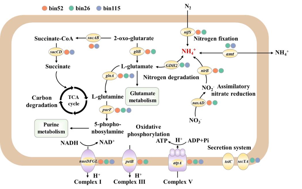 BMP與PE-MP微塑料圈中氮代謝關(guān)鍵微生物組成也存在明顯差異,變形菌在BMP上顯著富集而PE-MP微塑料圈增加了放線菌豐度,其中Ramlibacter主導了BMP與PE-MP微塑料圈中多條氮代謝差異途徑,BMP殘留增加土壤中Ramlibacter豐度的同時刺激該菌在微塑料圈中的進一步富集。利用宏基因組binning技術(shù)拼接獲得29個高質(zhì)量基因組,均分類為變形菌和放線菌,其中bin115.bin53和bin26都分類為Ramlibacter,這3個新型物種基因組(ANI<95%)含有調(diào)控氮降解、氮固定和同化硝酸鹽還原代謝路徑的多個拷貝基因,這些代謝路徑共同指向于銨態(tài)氮的生成。進一步發(fā)現(xiàn)BMP微塑料圈中的微生物物種調(diào)控氮代謝合成自身所需氮素的同時,通過攜帶的氨轉(zhuǎn)移基因,可將微塑料圈中的有效氮素轉(zhuǎn)運到土壤中,通過測定土壤中銨態(tài)氮的含量發(fā)現(xiàn),BMP殘留土壤中的銨態(tài)氮含量的確高于CK和PE-MP土壤,進而驗證了微生物基因組氮代謝機制(圖2)。該研究揭示出生物可降解地膜源微塑料較傳統(tǒng)地膜促進土壤有效氮素累積,為推進傳統(tǒng)地膜的減量與替代提供微生物學理論依據(jù)。