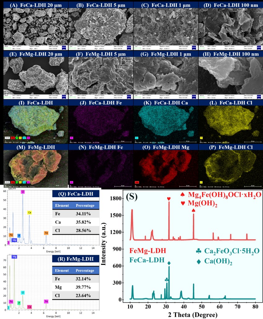 圖 2 鐵基層狀雙氫氧化物的結(jié)構(gòu)(A-H:SEM;I-P:EDS;S:XRD)