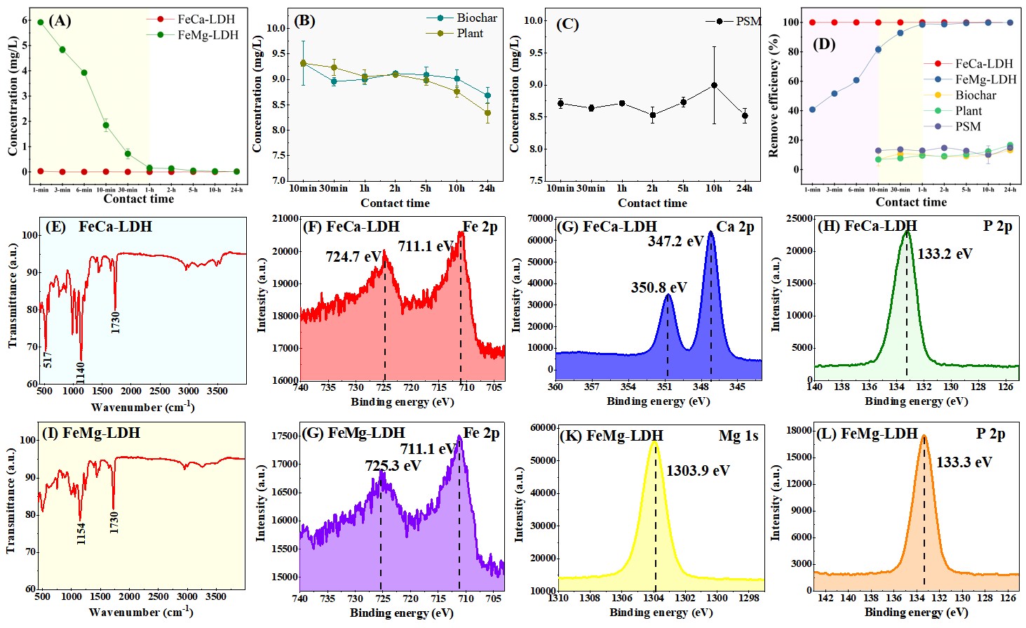 根據(jù)水滑石的層狀結(jié)構(gòu)特點(diǎn)和層間離子可交換屬性,東北地理所水環(huán)境污染防治團(tuán)隊(duì)通過控制金屬陽離子的比例、pH和溫度等反應(yīng)條件,采用共沉淀法成功合成了純凈的鐵基層狀雙氫氧化物(FeCa-LDH、FeMg-LDH)(圖1),其通式為[M1-x2+Mx3+ (OH)2]x+ (An-)x/n·mH2O,M2+和M3+是二價(jià)和三價(jià)金屬陽離子,其與OH-共同構(gòu)成了陽性主體層;A是層間陰離子,常見的有Cl-、SO42-、CO32-、HCO3-和NO3-。FeCa-LDH和FeMg-LDH呈六邊形、八面體結(jié)構(gòu)(圖2),孔徑介于6~18 nm之間,純度達(dá)99%以上。模擬實(shí)驗(yàn)結(jié)果表明,污水中磷濃度為10 mg/L,LDH添加量為2.5 g/L條件下,相比生物炭、微生物和植物的對(duì)照處理,F(xiàn)eCa-LDH和FeMg-LDH對(duì)污水中磷的去除率提高了525% - 661%,處理時(shí)間縮短至1 min - 1 h (圖3)。主要去除機(jī)制為靜電吸附、配位反應(yīng)和插層交換(圖 4)。研究還發(fā)現(xiàn),堿性條件下FeCa-LDH的除磷率可提高50%左右,但共存陰離子碳酸氫根對(duì)磷的去除率有輕微的抑制作用。FeCa-LDH材料的重復(fù)利用性良好,循環(huán)使用第5次時(shí)的磷去除率仍可達(dá)85%。該材料也具有良好的濃度波動(dòng)抗沖擊性能,污水中磷濃度為600 mg/L時(shí),磷的去除率為62%,可應(yīng)用于突發(fā)污染事故的應(yīng)急處理中。