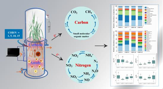 中國科學(xué)院東北地理與農(nóng)業(yè)生態(tài)研究所水環(huán)境污染與防治研究團隊科研人員在前期成果的基礎(chǔ)上(Zhu et al., 2022),評估了不同C/N比(1、5、10、15)對MFC-CWs污染物(COD、NH4+-N、NO3--N、NO2--N、TN和TP)去除效率、多種氣體(CO2、CH4、N2O和NH3)排放和生物產(chǎn)電性能的影響。