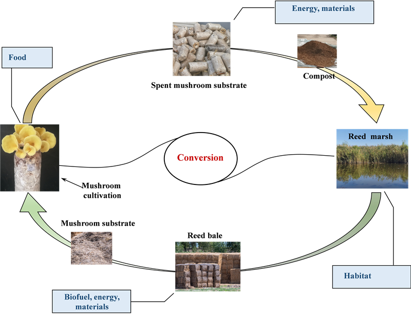 過(guò)去,蘆葦主要用于造紙?jiān)希诘胤皆旒垙S關(guān)停后,蘆葦產(chǎn)業(yè)面臨著轉(zhuǎn)型的急迫需求。為此,東北地理所濕地恢復(fù)與濕地農(nóng)業(yè)學(xué)科組基于蘆葦恢復(fù)和利用的研究基礎(chǔ),提出和構(gòu)建了鹽堿濕地“葦-菇-肥”模式,即以鹽堿濕地蘆葦作為基質(zhì),進(jìn)行食用菌栽培(Pleurotus citrinopileatus),利用發(fā)酵菌糠(SMS)改良鹽堿土壤,進(jìn)一步恢復(fù)蘆葦濕地,形成生態(tài)循環(huán)。研究表明,具有豐富木質(zhì)素、纖維素和多種微量元素的天然濕地蘆葦,可以替代木屑,栽培多種食藥用菌,生物學(xué)效率可達(dá)到70-112%;總結(jié)出了蘆葦基質(zhì)化栽培側(cè)耳屬食用菌的產(chǎn)量和品質(zhì)特征,粗蛋白含量高達(dá)28%,為蘆葦基質(zhì)工廠化制棒栽培提供科學(xué)建議;菌糠是伴隨食用菌栽培而產(chǎn)生的固體廢棄物,呈酸性,具有豐富的有機(jī)養(yǎng)分和元素成分,菌糠配合沙土,可有效改良鹽堿土壤,pH和電導(dǎo)率分別降低了12.33%和30.75%,土壤的總氮和有機(jī)質(zhì)增加了34.98%和46.55%,進(jìn)而顯著提高蘆葦?shù)拿芏群蜕锪浚艽蠓忍嵘}堿地蘆葦種群的恢復(fù)和重建效果。