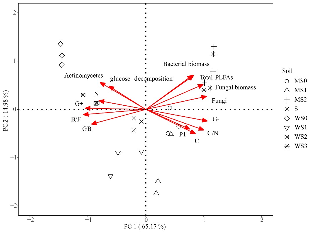 研究表明,在連作系統(tǒng)中,小麥連作土壤具有最高的土壤有機碳礦化速率,其次是大豆連作,玉米連作的土壤有機碳礦化速率最低。與未添加葡萄糖的處理相比,葡萄糖添加分別使小麥和玉米輪作系統(tǒng)中土壤累積碳礦化增加了195%–230%和255%–300%(圖1a)。大豆參與的小麥和玉米輪作系統(tǒng)中,葡萄糖添加引起的激發(fā)效應分別比小麥和玉米連作增加了27%–38%和22%–26%,但大豆種植頻率對小麥和玉米輪作系統(tǒng)中PE的影響不顯著(圖1)。在小麥和玉米輪作系統(tǒng)中,大豆的參與增加了土壤C/N比及真菌生物量,降低了土壤細菌/真菌的比值,促進了土壤激發(fā)效應的強度(圖2),但大豆種植頻率對土壤有機碳激發(fā)效應的影響不顯著。研究結(jié)果為通過調(diào)整豆科作物參與的輪作體系促進土壤碳固定提供了科學依據(jù)。