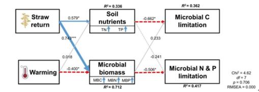 研究表明,短期增溫和秸稈還田除對土壤全氮含量具有顯著影響外,對其它基本土壤理化性質(zhì)無顯著影響。秸稈還田顯著增加了土壤微生物生物量碳和細菌豐度(16S基因拷貝數(shù)),而增溫顯著降低了土壤微生物生物量碳和細菌豐度。秸稈還田顯著緩解了微生物磷限制,但增溫和秸稈還田耦合削弱了這一作用效果(圖1)。增溫和秸稈還田主要通過土壤養(yǎng)分含量變化影響微生物碳限制,通過影響微生物生物量進一步調(diào)控微生物氮磷限制(圖2)。研究結果闡明了增溫和秸稈還田耦合對土壤微生物養(yǎng)分限制的影響機制,進一步加深了對溫帶農(nóng)田生態(tài)系統(tǒng)養(yǎng)分循環(huán)的認識。