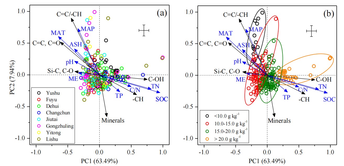 東北地理所土壤物質循環(huán)學科組研究人員利用在東北典型黑土帶吉林省范圍內采集的234個表層土壤樣品,通過傅里葉紅外光譜技術,結合氣候和地形因子,闡明了典型黑土有機質量質變化的空間分布特征及主要驅動因素,解析了土壤有機質化學官能團組成對土壤有機質穩(wěn)定性的調控機制。研究結果表明,典型黑土帶土壤有機碳含量變化范圍是8.2 -34.5 g/kg,有機碳含量和活性較高的脂肪族碳官能團的相對豐度從南到北呈增加趨勢,而穩(wěn)定性較強的芳香族碳官能團豐度和芳香族碳/脂肪族碳比例呈遞減趨勢,多糖和礦物結合態(tài)碳官能團無明顯區(qū)域性變化規(guī)律。主成分分析發(fā)現(xiàn)區(qū)域范圍內土壤有機質化學官能團的差異不顯著,但受土壤有機碳含量的影響更大,其中芳香族碳官能團與低有機質含量土壤顯著相關,脂肪族碳官能團與高有機質含量土壤相關,說明東北典型黑土帶南部氣溫較高、降水較大,低有機質含量的土壤中芳香族碳豐度越高,有機質的腐解程度越高(圖1)。本研究為評價土壤有機質及其穩(wěn)定性的空間分布提供了光譜學研究證據(jù)。