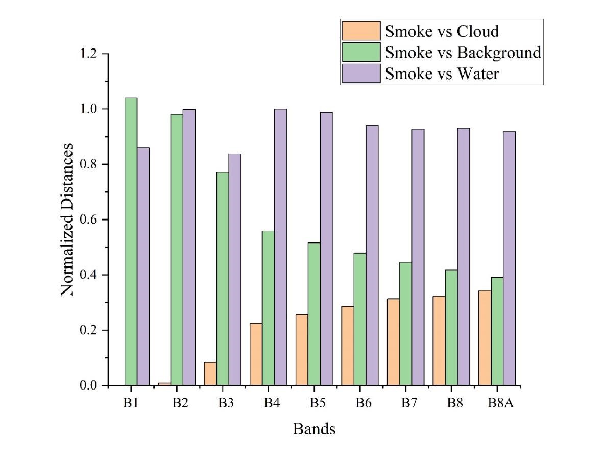 圖1 三對不同地物之間(煙羽對云、煙羽對背景、煙羽對水體)的可分離度