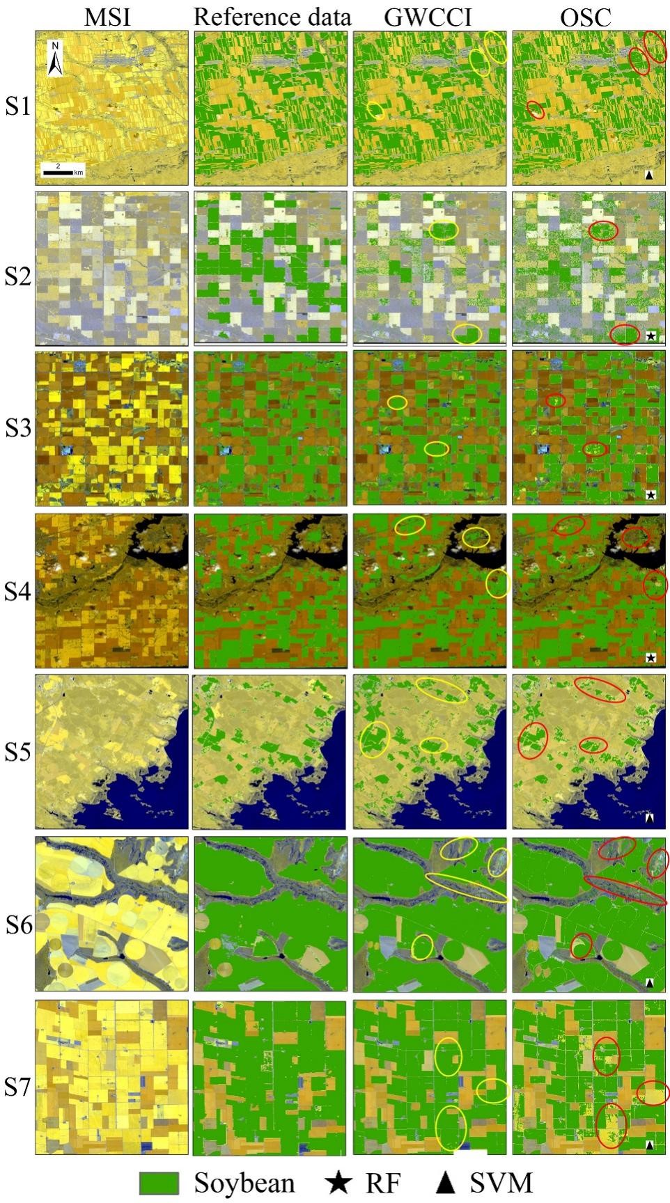 選擇全球四大典型大豆種植國(中國,美國,巴西和阿根廷)的7個縣(處于不同的氣候帶、不同的降水總量、不同的灌溉方式(旱作VS灌溉)以及不同的種植模式(單季和雙季))來證實GWCCI的有效性。我們將從中國東北黑土典型區域-海倫市計算得到的最佳閾值直接應用于其他6個研究區,并開展了連續5個年份(2017-2021)的測試。研究結果顯示,GWCCI能夠有效識別大豆空間分布,7個研究區連續5年的平均總分類精度為86.76%(k=0.74),顯著高于傳統機器學習方法(RF和SVM)。上述結果證實了GWCCI跨區域、跨年份的高效性和魯棒性。