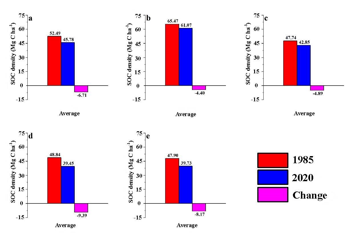 圖1東北地區(qū)35年來(lái)土壤有機(jī)碳密度變化(a代表東北地區(qū);b代表黑龍江省;c代表吉林省;d代表遼寧省;e代表內(nèi)蒙古)