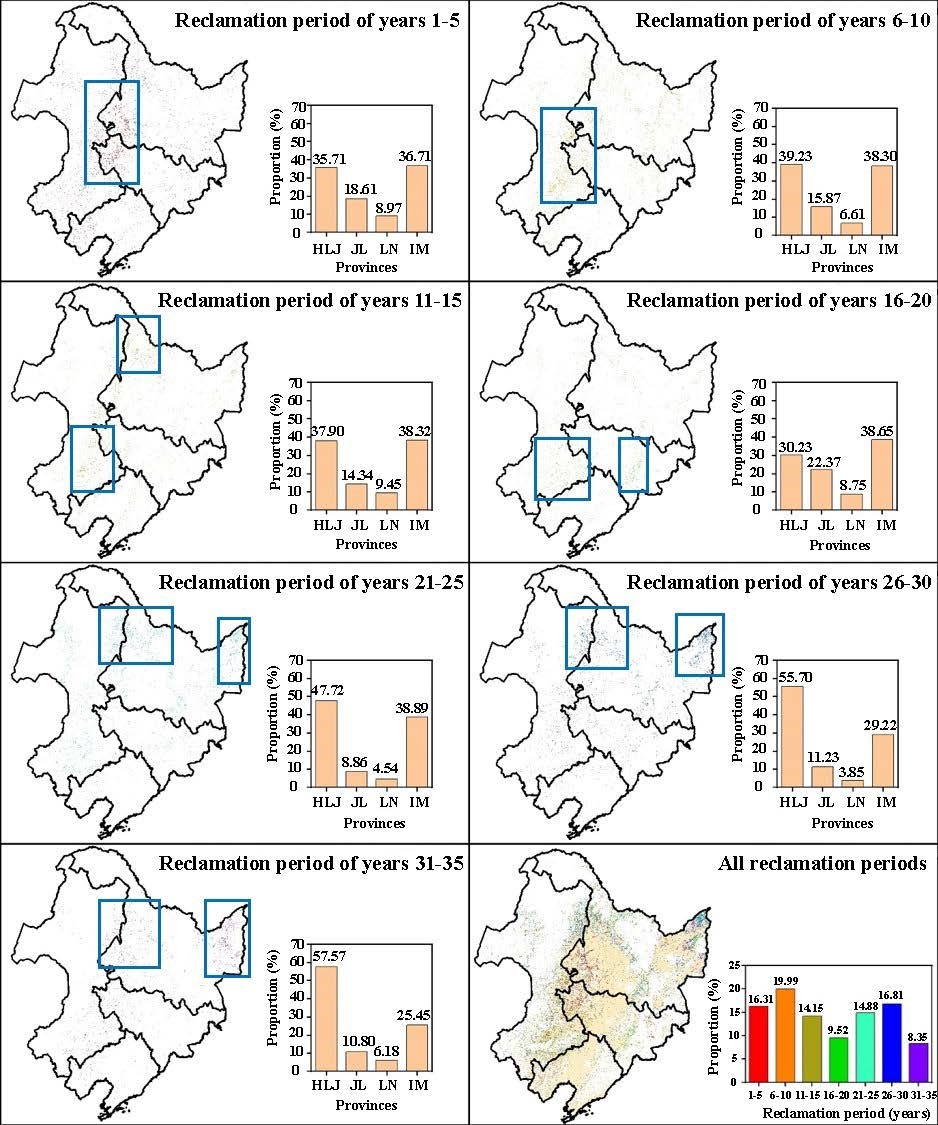 圖2東北地區(qū)耕地開(kāi)墾結(jié)果(藍(lán)色邊框表示不同開(kāi)墾年限大范圍分布區(qū)域)