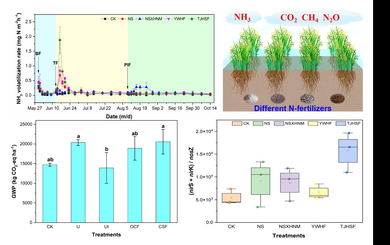 東北地理所水環境污染與防治團隊以吉林西部鹽堿稻田土壤作為研究對象,通過中宇宙試驗,評估了不同鹽堿水平與不同氮肥施用條件下稻田NH3揮發和GHG排放特征,并闡明了驅動碳氮氣體排放的微生物學機制。