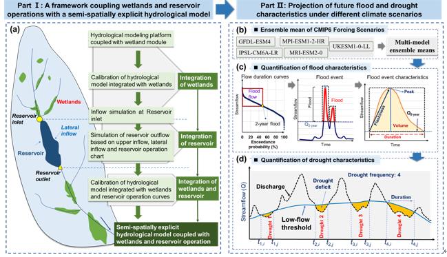 (a)流域濕地-水庫聯(lián)合調蓄的分布式耦合框架;(b)基于CMIP6的多情景數(shù)據(jù)的集合平均;(c)基于閾值法洪水事件的確定和特征的提取;(d)基于游程理論的干旱事件的確定及特征的提取。
