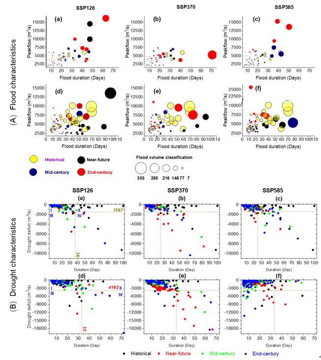 注:A:洪水持續(xù)時間-洪峰流量-洪量關系特征;B:干旱強度-持續(xù)時間關系。歷史時期(Historical):1971-2020年;近期(Near-future):2026-2050;本世紀中葉(Mid-century):2051-2075;本世紀末(End-century):2076-2100