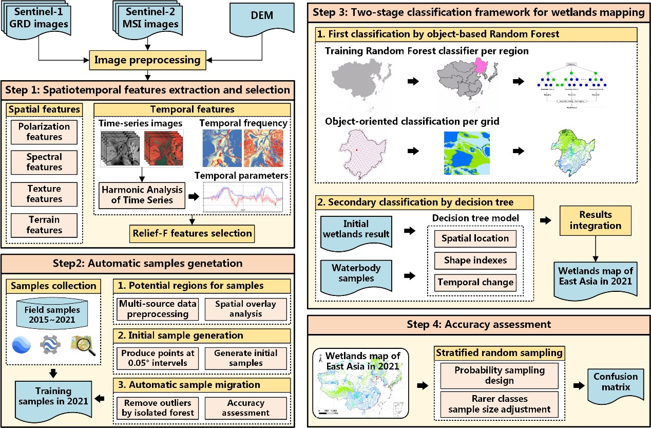 針對上述問題,在遙感大數(shù)據(jù)和云計算平臺(Google Earth Engine)的支持下,東北地理所濕地遙感、地理景觀遙感研究團隊以東亞地區(qū)為研究范圍,研發(fā)了一種集成隨機森林機器學習算法和層次決策樹分類算法的“兩段式”的大尺度濕地分類框架方法。利用多源參考數(shù)據(jù)和21萬多景Sentinel-1/2時間序列遙感影像,完成了東亞地區(qū)首套10米空間分辨率、多類型(3大類、12小類)的濕地空間分布圖(EA_Wetlands,2021),精度達88%以上。