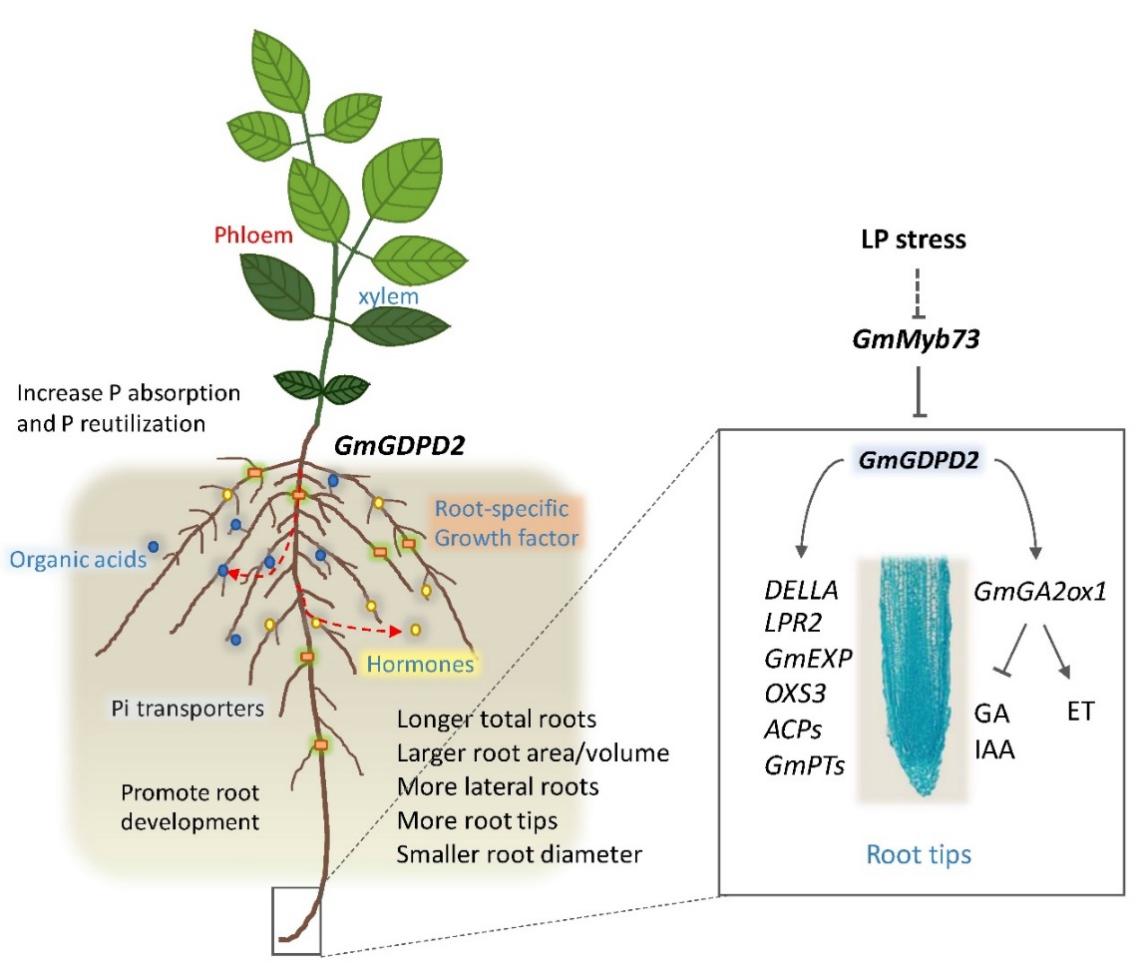 該研究鑒定了一個新的植物磷效率調(diào)控模塊,闡明了以GmGDPD2為中心的分子模塊是如何調(diào)控大豆根系發(fā)育和低磷耐受力。GmMyb73感知磷饑餓后表達(dá)下調(diào),促進(jìn)GmGDPD2的表達(dá),并通過GmGA2ox1活性影響GA、生長素與乙烯等激素水平抑制主根伸長,誘導(dǎo)側(cè)根和根毛形成,從而影響磷的吸收與利用。因此,以GmGDPD2為中心的磷效率調(diào)控模塊代表了一個很有潛力的核心樞紐,可以通過重塑根系結(jié)構(gòu)特性來提高大豆對低磷脅迫的耐受性并最終提高產(chǎn)量,為未來通過協(xié)同改良多個性狀實現(xiàn)大豆產(chǎn)量潛力突破、減少磷肥施用提供了新思路。