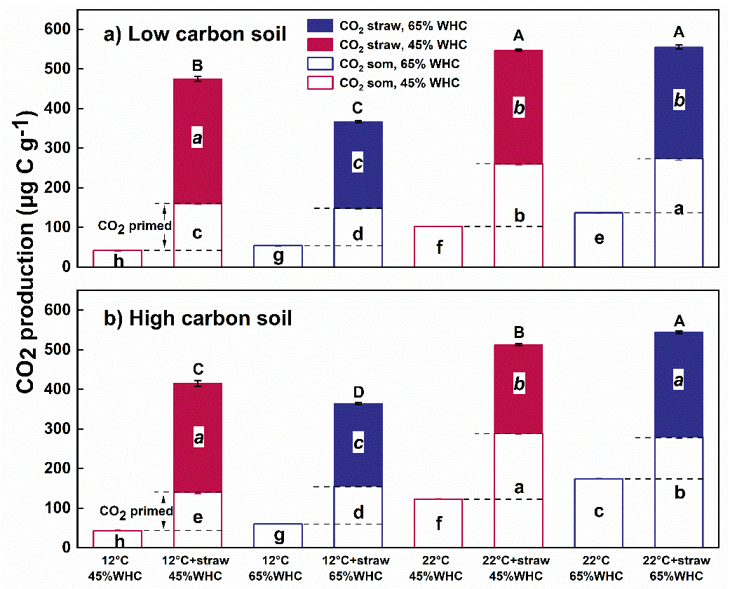為此,東北地理所土壤物質(zhì)循環(huán)學(xué)科組李祿軍團(tuán)隊(duì)研究人員以東北農(nóng)田黑土為研究對象,通過微宇宙控制實(shí)驗(yàn),利用13C穩(wěn)定同位素示蹤技術(shù),深入探究土壤溫度(12°C和22°C)和濕度(45%WHC和65%WHC)及其耦合作用對土壤有機(jī)質(zhì)激發(fā)效應(yīng)及其溫度敏感性的影響。
