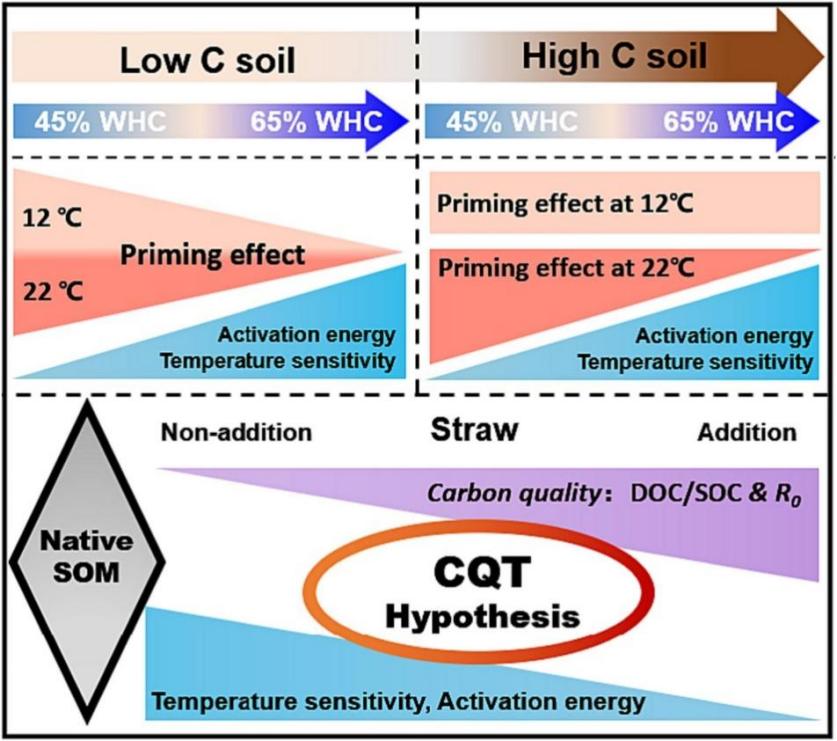 土壤有機(jī)質(zhì)(SOM)在農(nóng)田土壤肥力維持、碳封存和緩解氣候變化起著至關(guān)重要的作用,將作物殘留物還田被認(rèn)為是維持和提升SOM的重要措施之一,然而,殘留物還田可能加速SOM的礦化,即為激發(fā)效應(yīng)(PE),溫度敏感性(Q10)作為表征SOM礦化特性的重要參數(shù),很大程度上決定著陸地生態(tài)系統(tǒng)碳循環(huán)與氣候變暖之間反饋關(guān)系的方向與強(qiáng)度。影響SOM礦化過程的因素既包括生物因素,如土壤微生物和植物等,也包括非生物因素,如土壤水分和溫度等。盡管大量研究對SOM礦化過程及其驅(qū)動機(jī)制開展了深入探討,但是在外源有機(jī)物輸入條件下,多因素耦合影響下如何影響SOM礦化過程尚不明確。