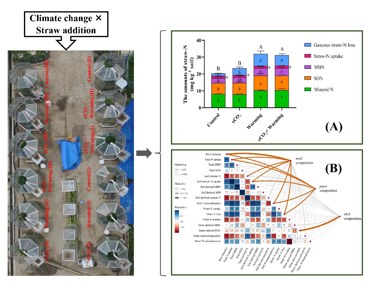 東北地理所農(nóng)田分子生態(tài)學(xué)科組研究人員利用Open-Top Chamber (OTC)模擬大氣CO2升高(700 ppm)和升溫(比環(huán)境氣溫高2℃)條件,采用15N穩(wěn)定同位素示蹤技術(shù)和擴(kuò)增子測(cè)序技術(shù),設(shè)置添加15N秸稈以及無(wú)秸稈對(duì)照,探究大氣CO2和溫度升高對(duì)秸稈添加后秸稈氮礦化和水稻根際氮礦化微生物群落特征的影響。研究發(fā)現(xiàn),大氣CO2和溫度共同升高雖然對(duì)水稻秸稈氮的利用效率沒(méi)有顯著影響,但可以顯著增加根際秸稈氮礦化量和土壤氮礦化量,而且根際土壤氮礦化量顯著高于秸稈氮礦化量。氣候變化增加根際秸稈氮向微生物量氮、可溶性有機(jī)氮和礦質(zhì)氮庫(kù)中的轉(zhuǎn)化(圖1A)。在秸稈添加的條件下,CO2濃度和溫度升高顯著增加了亮氨酸氨肽酶(pepA)基因的豐度,同時(shí)顯著改變了根際和非根際土壤中與脲酶(ureC)和亮氨酸氨肽酶(pepA)相關(guān)的微生物群落組成,并且與秸稈氮礦化以及土壤氮礦化均顯著相關(guān)(圖1B)。大氣CO2濃度和溫度升高通過(guò)改變水稻根際氮礦化酶合成相關(guān)微生物群落,加快了根際土壤氮和秸稈氮的礦化過(guò)程,并且添加秸稈不能有效緩解氣候變化對(duì)根際土壤氮素礦化的促進(jìn)作用。