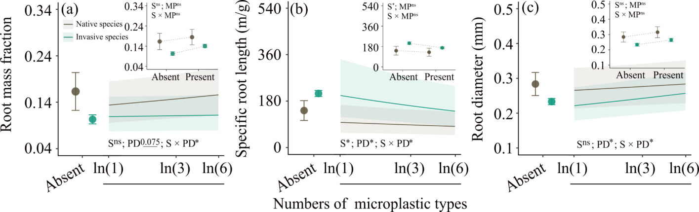 ????結果表明:隨土壤中微塑料多樣性增加,微塑料污染對植物生長的抑制作用逐漸增強,且微塑料多樣性對外來入侵植物的負面影響強于本地植物(圖2),這可能與根系分配和根系厚度的變化不同有關(圖3);并且,與本地植物不同,無論土壤中是否存在微塑料污染,外來入侵植物都會比本地植物產生更多生物量。