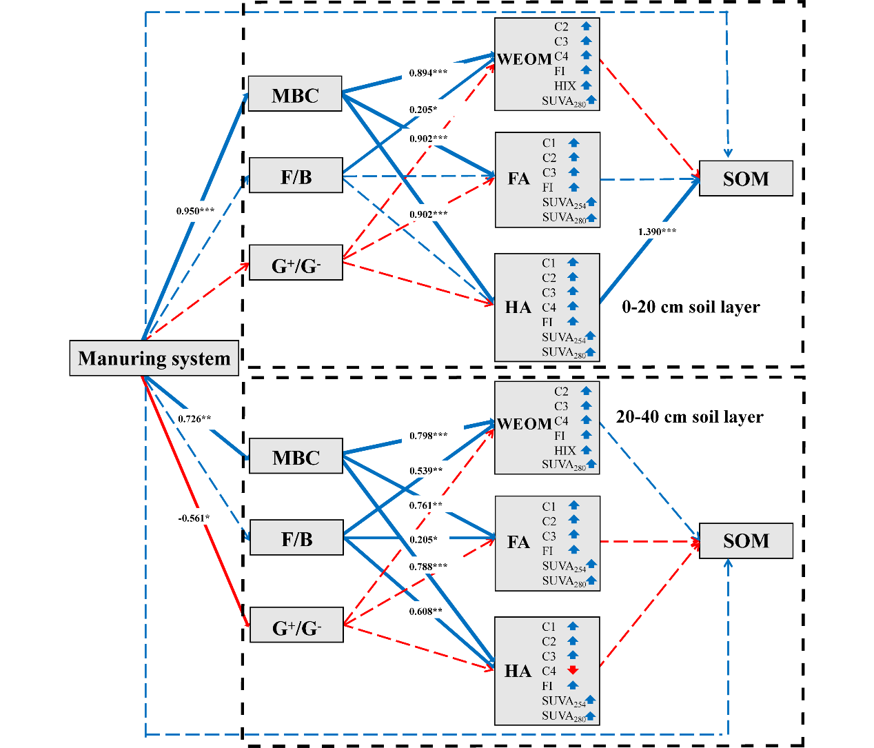 圖3. 偏最小二乘路徑模型展示了施肥系統(tǒng)和微生物生物量碳(MBC)、真菌和細(xì)菌比例(F/B)、革蘭氏陽性細(xì)菌和革蘭氏陰性細(xì)菌比例(G+/G-)、水溶性有機(jī)質(zhì)(WEOM)、富里酸(FA)和胡敏酸(HA)對0-20 cm和20-40 cm土層土壤有機(jī)質(zhì)(SOM)的直接和間接影響。模型擬合優(yōu)度(GoF)為0.741