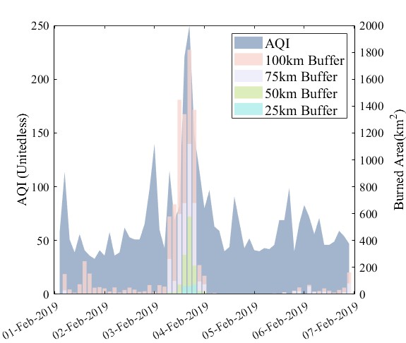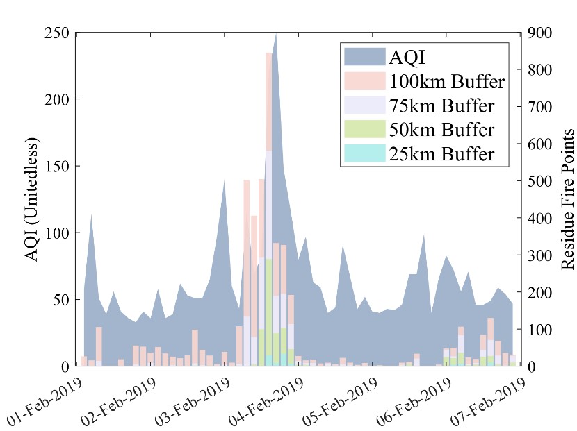 本研究通過提取可見紅外成像輻射儀(VIIRS)火點數據、中分辨率成像光譜輻射儀(MODIS)燃燒面積數據,對比研究了這兩種不同秸稈焚燒參數與大慶市為中心不同緩沖區空氣質量的相關性。