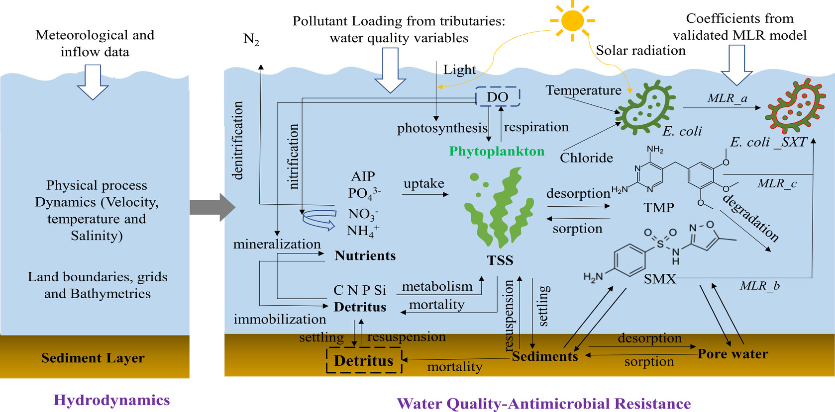水生環(huán)境中微生物對(duì)抗生素的耐藥性(AMR)日益增加,已被世界衛(wèi)生組織列為人類面臨的十大全球公共衛(wèi)生威脅之一。因此,迫切需要建立和量化水生環(huán)境中抗生素和相關(guān)耐藥性風(fēng)險(xiǎn)。中國科學(xué)院東北地理所張敬杰研究員參與并指導(dǎo)構(gòu)建了綜合建??蚣?,預(yù)測(cè)抗生素、大腸桿菌及其相關(guān)耐藥菌株(ARB)的時(shí)空分布,用于識(shí)別AMR熱點(diǎn),評(píng)估抗生素在水生環(huán)境中的潛在環(huán)境風(fēng)險(xiǎn)。本研究對(duì)兩種具有代表性的抗生素(SMX和TMP)、指示菌(大腸桿菌)及其相關(guān)的ARB(EC_SXT)進(jìn)行了建模。風(fēng)險(xiǎn)評(píng)估表明,預(yù)測(cè)的TMP比SMX具有更高的AMR風(fēng)險(xiǎn),但SMX具有更高的生態(tài)風(fēng)險(xiǎn)。該研究提出了一個(gè)混合建??蚣?,將統(tǒng)計(jì)模型與水動(dòng)力水質(zhì)模型結(jié)合起來,以整體的方式預(yù)測(cè)AMR,從而促進(jìn)更好的風(fēng)險(xiǎn)管理發(fā)展。