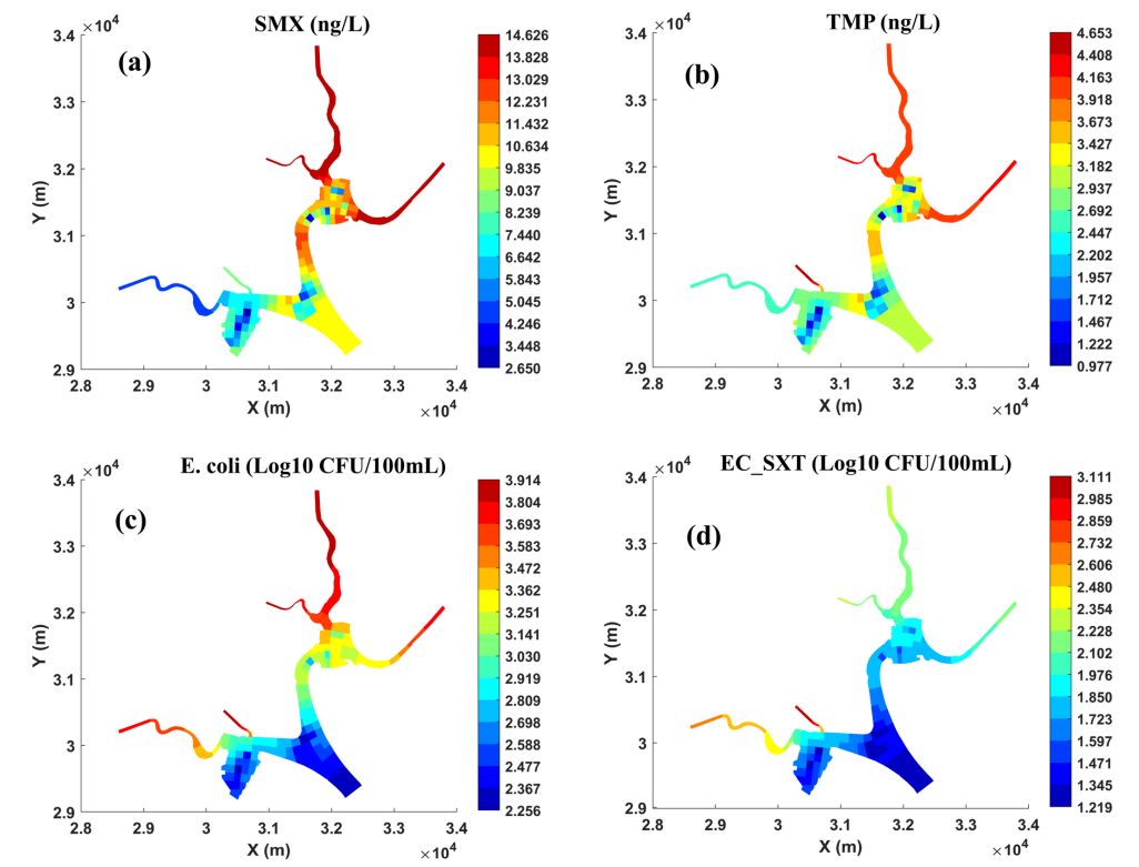 圖4 模擬物質(zhì)的空間分布:(a)SMX;(b)TMP;(c)E.coli;(d)EC_SXT,來自HWQ-AMR模型