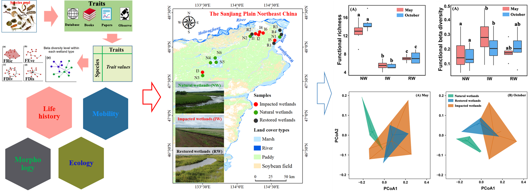 濕地作為地球上山水林田湖草生命共同體的重要組成,具有不可替代的生態(tài)功能。受氣候變化和人類活動的疊加影響,全球濕地退化嚴(yán)重,引發(fā)了一系列的生態(tài)環(huán)境問題。濕地生態(tài)恢復(fù)受到國內(nèi)外高度關(guān)注,廣泛實施了較大規(guī)模的濕地恢復(fù)工程。2002年以來,中國黑龍江三江平原開展了一系列淡水沼澤濕地恢復(fù)示范性工作,但缺乏針對濕地生境功能恢復(fù)成效的評估研究。為此,中國科學(xué)院東北地理所科研人員以黑龍江省三江平原沼澤濕地為研究對象,應(yīng)用水生無脊椎動物作為關(guān)鍵指示生物類群,通過大量野外調(diào)查和定位研究,采用功能性狀與穩(wěn)定同位素表征方法,開展了濕地恢復(fù)成效評估研究。