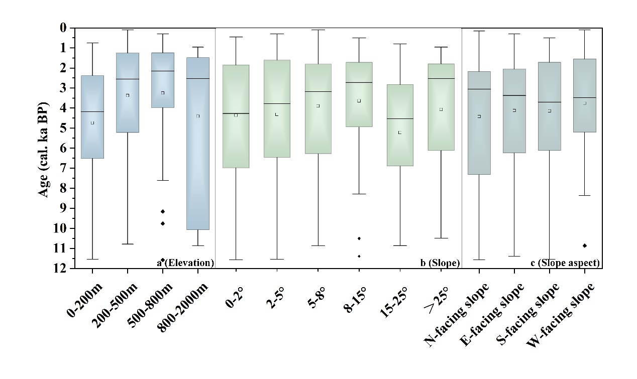 圖1?全新世東北地區泥炭沼澤在不同海拔、坡度和坡向地形下形成時間