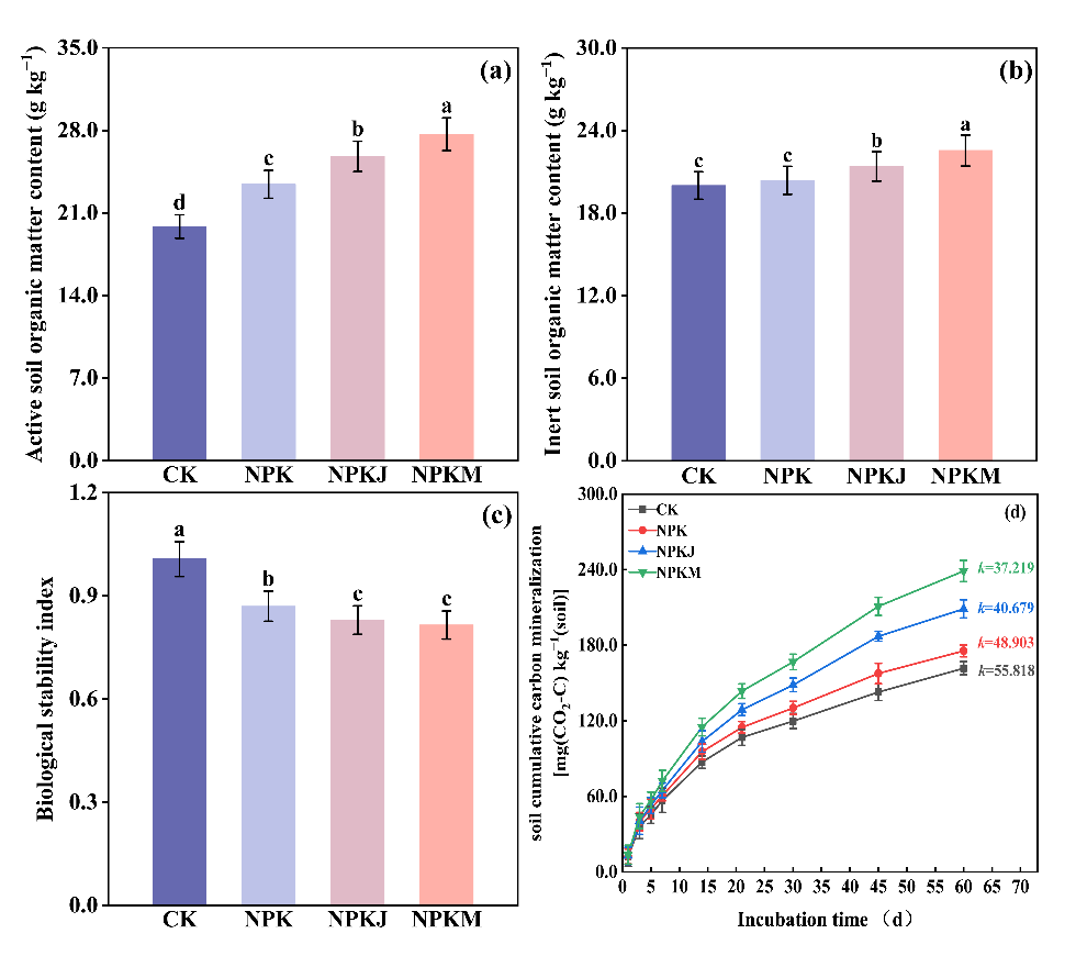 東北地理所黑土保護與利用學(xué)科組的科研人員以東北黑土為研究對象,依托長期田間定位試驗,系統(tǒng)分析了顆粒態(tài)有機質(zhì)(POM)和礦質(zhì)結(jié)合態(tài)有機質(zhì)(MAOM)組成和占比表征的SOM物理穩(wěn)定性、SOM化合物組成表征的化學(xué)穩(wěn)定性以及生物穩(wěn)定性指數(shù)(BSI)和礦化速率常數(shù)表征的SOM生物穩(wěn)定性對施肥管理方式的響應(yīng)。該研究旨在探究不同施肥措施對SOM綜合穩(wěn)定性的影響及調(diào)控途徑。