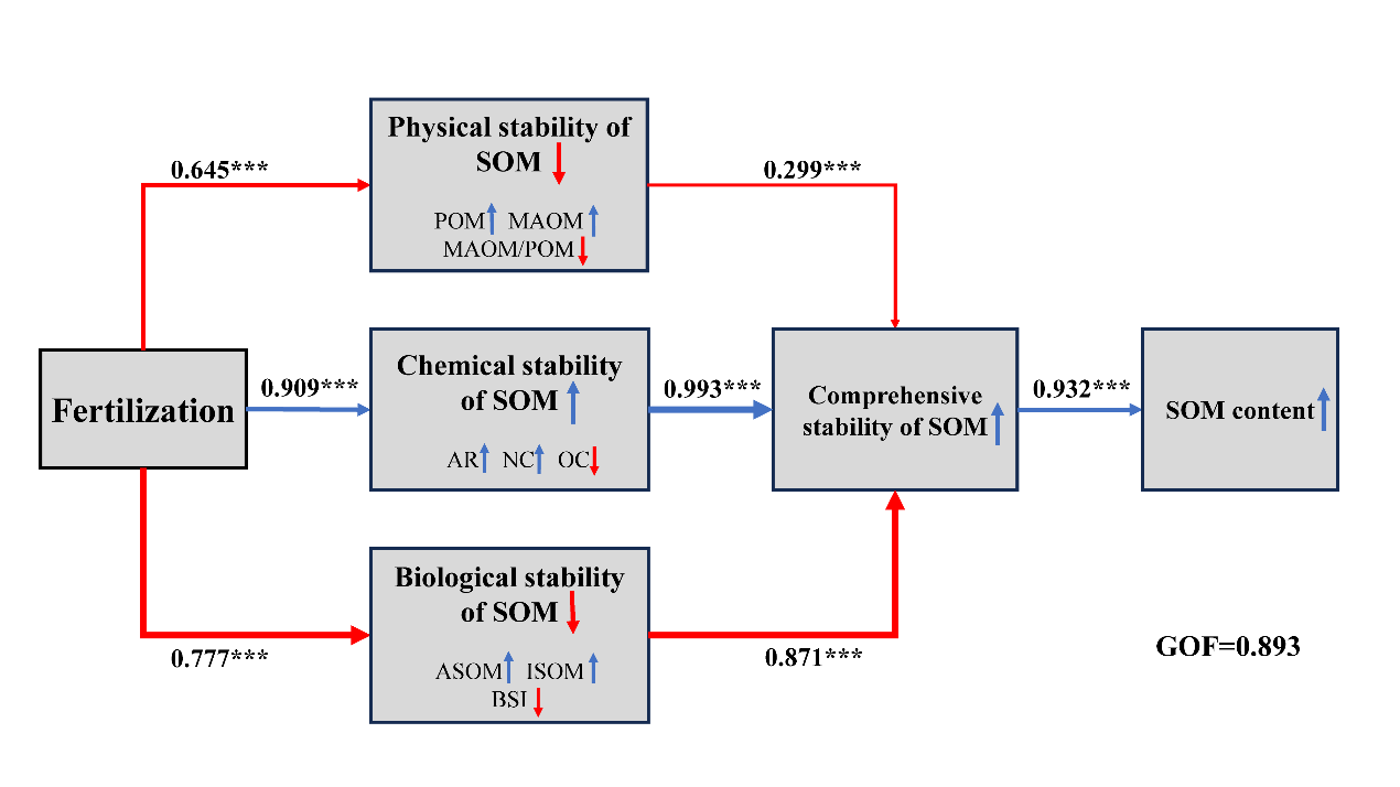 研究發(fā)現(xiàn),與不施肥相比,施肥措施主要促進了具有較高活性的POM含量的增加,其中有機物料的施用效果顯著優(yōu)于單一施用化肥,但施肥后降低了MAOM/POM,進而降低了SOM的物理穩(wěn)定性。另外,長期施肥顯著增加了SOM中的芳香化合物、含氮化合物和含硅化合物等穩(wěn)定成分的含量,提高了SOM的化學(xué)穩(wěn)定性。而針對SOM的生物穩(wěn)定性,施肥主要促進了SOM中可礦化有機質(zhì)(ASOM)的形成,提高了SOM的礦化速率常數(shù),降低了SOM的BSI,從而降低了SOM的生物穩(wěn)定性(圖1)。不同施肥措施主要通過提高SOM的化學(xué)穩(wěn)定性而提高了SOM的綜合穩(wěn)定性,而SOM穩(wěn)定性的變化直接影響了SOM的含量(圖2、圖3)。研究結(jié)果證明,施肥可以提高SOM的綜合穩(wěn)定性,且化肥配施秸稈和化肥配施有機肥的效果明顯優(yōu)于單施化肥。本研究為長期不同施肥管理下SOM穩(wěn)定性變化及其固存機制提供了科學(xué)依據(jù)。
