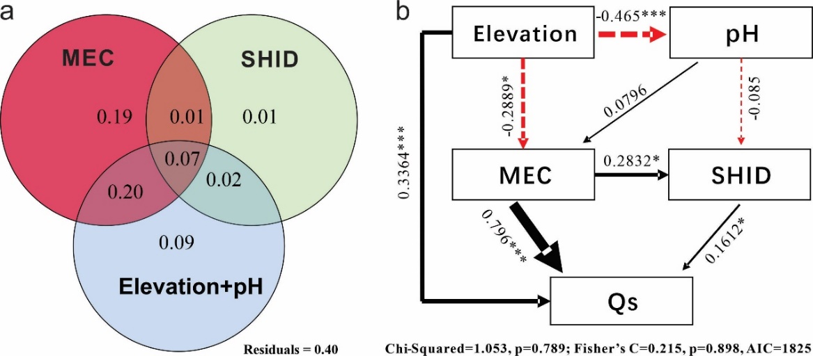 VPA分析證實MEC對Qs的影響最大,MEC可單獨解釋Qs變化的19%, MEC與環境因素(海拔和pH)結合可以共同解釋20%的Qs變異性(圖3a)。環境因素或SHID單獨對Qs變異的解釋能力相對較低,分別為9%和1%,而MEC、SHID和環境因素聯合可解釋60%的Qs變異性。SEM模型顯示海拔、MEC和SHID均對Qs具有正效應,其大小順序為MEC>海拔>SHID(圖3b)。