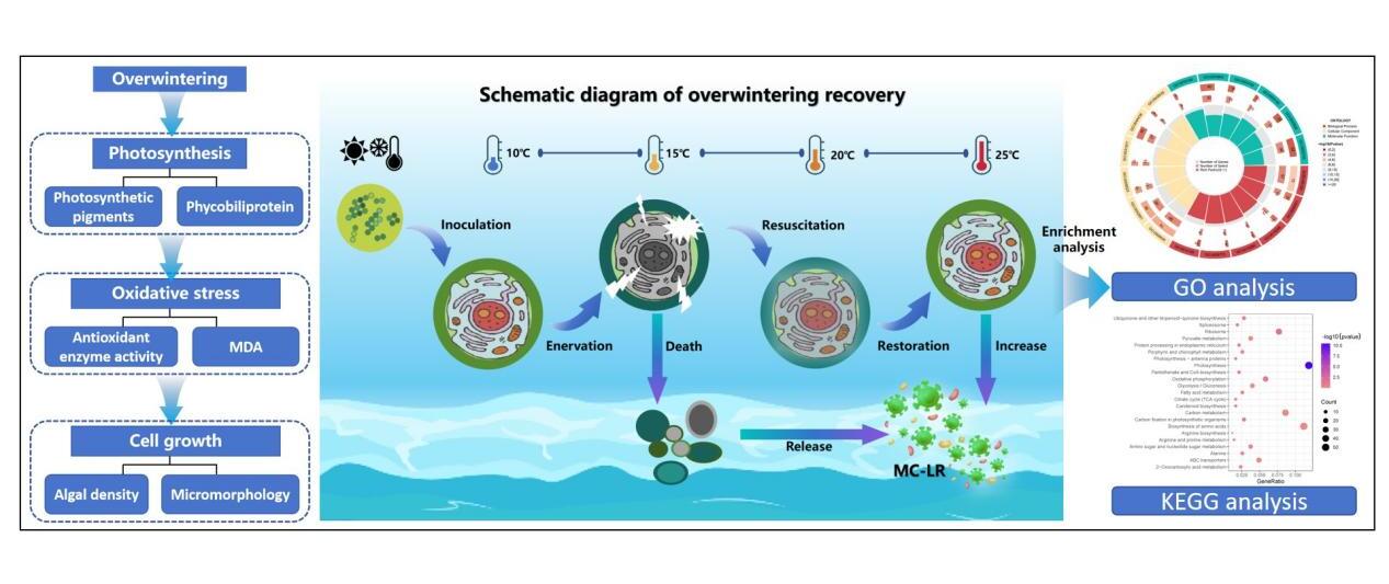 為探索上述科學問題,中國科學院東北地理與農業生態研究所水環境污染與防治研究團隊以最為常見的有毒藍藻—銅綠微囊藻(M.aeruginosa)為研究對象,模擬研究了藻體在越冬休眠后隨環境溫度升高的動態復蘇過程。研究結果表明,隨環境溫度的逐步上升,越冬(4℃低溫及黑暗條件下休眠12天后,由10℃逐步上升至25℃)和非越冬處理組(直接由10℃上升至25℃)的藻密度均呈先下降(10-15℃區間)后上升(15-25℃區間)的變化趨勢。在整個培養期間,越冬處理組的藻密度始終低于非越冬處理組,當培養實驗結束時,越冬處理組的藻密度相較于非越冬處理組降低了55.6%。在環境溫度為10-15℃區間時,越冬處理抑制了藻體光合效率和微囊藻毒素(MC-LR)的產生,激活了抗氧化系統,破壞了細胞超微結構,導致部分細胞死亡;隨著環境溫度上升至20-25℃區間,藻體迅速增殖,光合效率升高,部分受損的細胞結構也逐漸恢復。基于信號通路分析得出,越冬處理下調了與光合作用、核糖體、卡爾文循環和氧化磷酸化相關的基因表達,從而阻礙了M. aeruginosa的生長和代謝能力。