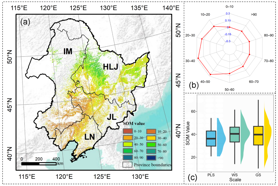 圖1.(a)東北黑土區(qū)SOM空間分布(HLJ:黑龍江:JL:吉林;LN:遼寧;IM:內(nèi)蒙古);(b)不同含量有機質(zhì)區(qū)域面積占比;(3)不同尺度下SOM含量平均值