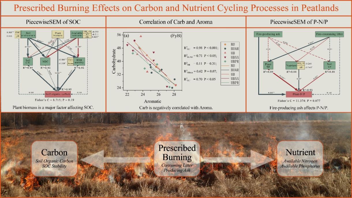 中國科學院東北地理所濕地演化與生態(tài)功能學科組與東北林業(yè)大學、吉林農(nóng)業(yè)大學等高校合作,自2020年起在大興安嶺地區(qū)的林緣泥炭地進行長期計劃火燒模擬試驗(圖 1),探究計劃火燒影響下多年凍土區(qū)泥炭地土壤碳穩(wěn)定性以及養(yǎng)分循環(huán)影響。研究發(fā)現(xiàn),隨著計劃火燒次數(shù)的增加,泥炭土壤總碳含量逐漸下降,原因在于連續(xù)火燒導(dǎo)致游離顆粒有機物(fPOM)降低。土壤有機碳的結(jié)構(gòu)方程模型表明,計劃火燒后植物生物量的增加直接影響了泥炭地的碳累積,而土壤含水率和pH通過影響土壤碳氮比和土壤有機碳穩(wěn)定性間接影響了碳累積(圖2)。此外,計劃火燒導(dǎo)致泥炭地生態(tài)系統(tǒng)從氮限制向磷限制轉(zhuǎn)化,植物氮磷比的結(jié)構(gòu)方程模型表明,火后產(chǎn)生的熱解碳是驅(qū)動氮限制向磷限制轉(zhuǎn)化的主要原因。