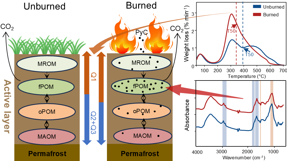 與此同時,連續(xù)低強度的計劃火燒降低了多年凍土區(qū)泥炭地的土壤碳穩(wěn)定性,火后熱解碳的輸入成為泥炭土壤輕組碳組分的一部分,并主要保留在fPOM組分中(圖 3)。進一步化學分析表明,計劃火燒導(dǎo)致fPOM碳成分變化,火燒區(qū)的fPOM中芳香度增加了32%,這意味著泥炭土壤fPOM組分的穩(wěn)定性明顯增加。然而,連續(xù)火燒后泥炭土壤熱穩(wěn)定性下降,表現(xiàn)為Q1比例增加以及T50降低,計劃火燒通過改變fPOM碳組成,影響了土壤熱穩(wěn)定性。而盡管增加了fPOM中芳香族化合物含量,但同時也促使土壤酶活性和二氧化碳的排放量的增加,對土壤碳穩(wěn)定性產(chǎn)生了十分復(fù)雜的影響。