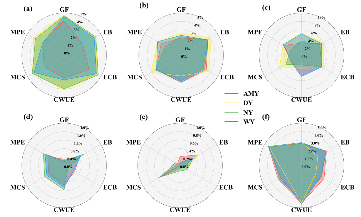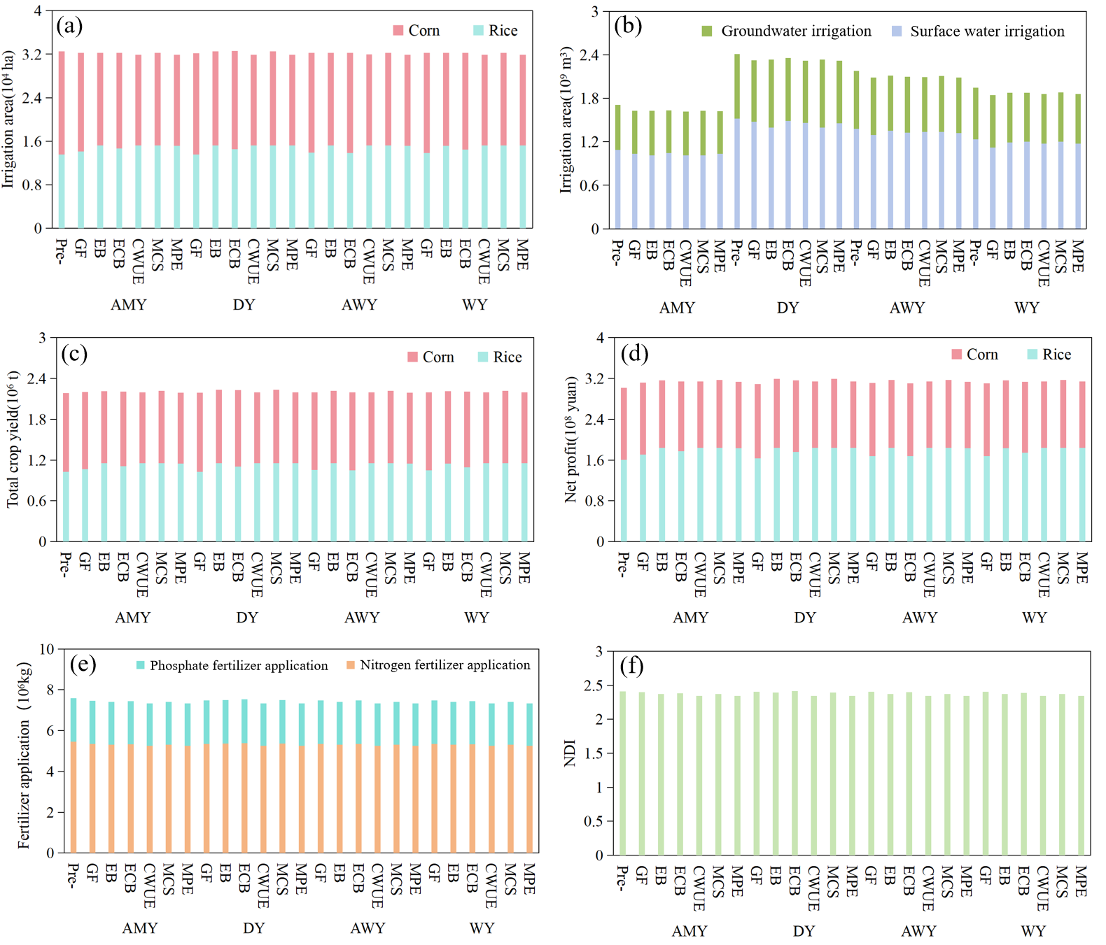 圖3 大安灌區(qū)的優(yōu)化配置結(jié)果 (a–d)年灌溉面積、灌溉水源、作物總產(chǎn)量和每種作物的凈利潤(rùn);(e)氮磷肥施用量;(f)NDI污染指數(shù)(側(cè)重地下水足跡(GF),側(cè)重經(jīng)濟(jì)效益(EB),側(cè)重生態(tài)效益(ECB),側(cè)重作物用水效率(CWUE),側(cè)重碳固存(MCS),側(cè)重污染物排放(MPE))。
