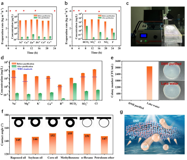 在實際應用中,DNH對重金屬污染的工業廢水(圖2a)、蘇打鹽堿水(圖2b)都表現出極好的處理效果。采用中國北方近海海水進行了戶外太陽能淡化實驗,結果顯示,水體中Na+、Mg2+、K+、Ca2+、B3+、HCO3?、SO42?和Cl?的含量在處理后分別為 0.025、0.014、0.023、0.037、0.001、6.995、0.079和0.157 mg/L,對應的去除率分別為99.999%、99.999%、99.994%、99.990%、99.957%、95.062%、99.996% 和99.999%(圖2d)。凈化水中各種離子的濃度遠低于中國和WHO規定的飲用水標準限值。此外,DNH具有良好的除菌效果(圖2e),以及水下超疏油性,其對菜籽油、大豆油、玉米油和三種油性溶劑的接觸角均超過145°(圖2f),實現了優異的防污能力,體現了其廣泛的應用潛力。