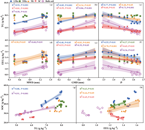 東北地理所黑土保護(hù)與利用學(xué)科組研究人員以1985年在東北黑土區(qū)建立的四種不同土地利用類型(裸地、農(nóng)田、草地和林地)為研究對象,利用團(tuán)聚體分級的方法探討了不同團(tuán)聚體粒徑中SOC、全氮(TN)以及GRSP(總球囊霉素TG和易提取球囊霉素EEG)的含量變化。研究結(jié)果表明,草地和林地生態(tài)系統(tǒng)的大團(tuán)聚體比例、SOC、TN和GRSP含量均顯著高于農(nóng)田和裸地。TG在原土和大團(tuán)聚體中的含量與土壤有機(jī)碳呈顯著正相關(guān),而EEG在較小團(tuán)聚體粒徑中發(fā)揮了更重要的作用。球囊霉素組分在不同團(tuán)聚體尺寸中對土壤有機(jī)碳積累的差異性影響,突顯了SOC動態(tài)的復(fù)雜性以及考慮團(tuán)聚體尺度過程的重要性。此外,我們觀察到GRSP組分與土壤團(tuán)聚體穩(wěn)定性之間存在顯著正相關(guān)關(guān)系。這些發(fā)現(xiàn)強(qiáng)調(diào)了GRSP作為一種持久性結(jié)合劑的關(guān)鍵作用,它積極參與土壤團(tuán)聚體的形成和穩(wěn)定,從而間接增強(qiáng)了土壤有機(jī)碳的保護(hù)和持久性。總體而言,本研究揭示了土地利用方式、土壤團(tuán)聚體、GRSP和SOC之間的復(fù)雜關(guān)系。研究結(jié)果強(qiáng)調(diào)了保護(hù)和恢復(fù)自然植被覆蓋(如草地和林地)對于促進(jìn)土壤有機(jī)碳固存和緩解氣候變化的關(guān)鍵重要性。