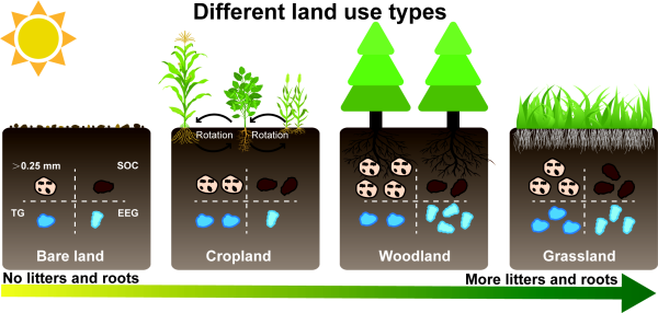 土壤是陸地生態(tài)系統(tǒng)中最大的碳庫,其碳儲存能力與土地利用方式密切相關(guān)。不同土地利用方式影響土壤碳和氮的動態(tài),而土壤團(tuán)聚體是影響土壤有機(jī)碳(SOC)的核心機(jī)制,尤其是大團(tuán)聚體通過物理和化學(xué)機(jī)制保護(hù)SOC。土壤球囊霉素相關(guān)蛋白(GRSP)直接貢獻(xiàn)于土壤碳庫,并在碳儲存和團(tuán)聚體穩(wěn)定性中起關(guān)鍵作用。然而,同一環(huán)境條件下不同土地利用方式對GRSP積累的影響研究不足,GRSP在團(tuán)聚體中的分布及其對SOC的作用仍需進(jìn)一步闡明。