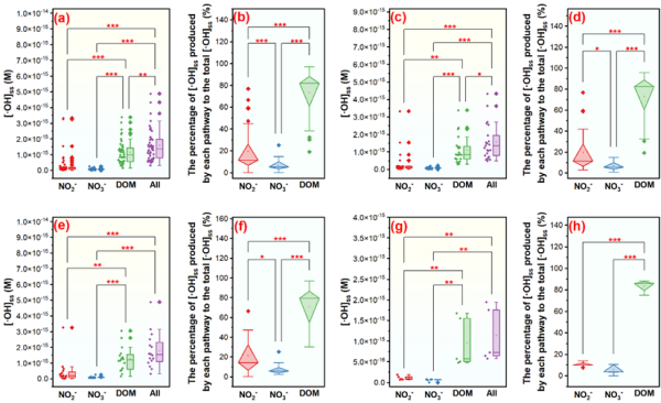 研究發現,RIs的生成與水體中常規理化指標之間存在復雜的相互作用關系(圖1)。單線態氧(1O2)的生成對pH較為敏感,三重激發態DOM(3DOM*)主要受鹽分調節,而羥基自由基(?OH)受NO2-、NO3-和DOM的影響更大;水體中的磷對RIs呈現出雙重調節作用:一方面RIs穩態濃度隨著TP濃度升高而增加;另一方面,過量的磷則會通過競爭性抑制作用降低RIs的量子產率。?OH作為自然界中最普遍存在且氧化能力最強的活性氧物種,其生成過程與1O2和3DOM*相比更為復雜。因此,本研究進一步探究了?OH的主要生成過程與潛在機制。結果表明,NO2-、NO3-和DOM的光化學反應對?OH生成的貢獻率分別為19.50%、6.93%和73.57%,證實DOM光解是鹽堿化農業水體中?OH的主要生成途徑(圖2)。光譜學特征分析表明,在鹽堿化農業水體中,相較于DOM濃度,其平均分子量對RIs生成的影響更大。整體而言,鹽堿化地區農業水體從源頭經由溝渠流入下游河湖水體的過程中,DOM光解始終是?OH的主要生成途徑,且在下游水體中占比最高(83.28%);NO2-和NO3-光解的貢獻相對較小,且在下游水體中兩者對?OH生成的貢獻占比均降低。
