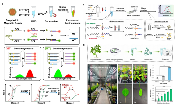圖1. (A)比率信號擴增輸出窗口、(B)橋聯探針識別SNP以及(C)大豆基因組提取與檢測示意圖