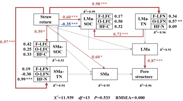 圖1秸稈還田對團聚體內(nèi)碳氮含量以及孔隙結構影響的結構方程模型