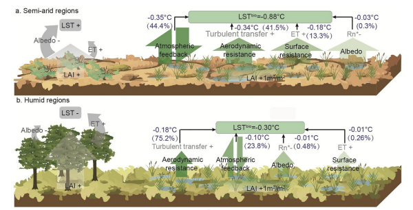 圖1. 不同干濕條件下濕地植被變化對地表溫度的反饋差異及機制