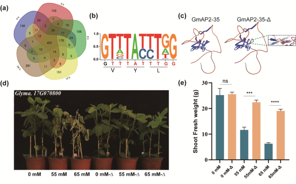 近日,東北地理與農(nóng)業(yè)生態(tài)所農(nóng)田有害生物控制學(xué)科組孟凡立研究團(tuán)隊(duì),利用轉(zhuǎn)錄組數(shù)據(jù)鑒定大豆堿脅迫(pH=9.1)處理0h、3h、6h、12h和24h的微外顯子序列,分析微外顯子序列特點(diǎn)和參與編碼的蛋白結(jié)構(gòu)域(圖1),系統(tǒng)解析了鹽堿脅迫前后的大豆微外顯子動(dòng)態(tài)變化。以AP2轉(zhuǎn)錄因子家族為例,創(chuàng)制了9bp微外顯子缺失以及正常轉(zhuǎn)錄本的轉(zhuǎn)基因大豆材料,結(jié)果表明微外顯子缺失在不改變蛋白質(zhì)結(jié)構(gòu)的條件下,增強(qiáng)大豆對(duì)鹽堿脅迫的耐受性(圖1)。該研究成果首次探究了微外顯子在大豆響應(yīng)鹽堿脅迫的調(diào)控作用,為培育耐鹽堿大豆新品種提供新思路。