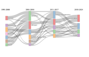 近日,中國(guó)科學(xué)院東北地理所鹽堿地資源與利用學(xué)科組在生態(tài)學(xué)期刊《Ecological Processes》上發(fā)表了題為上發(fā)表了題為“Towards smart soil carbon pool management of grassland: a bibliometric overview from past to future”的研究論文。該研究運(yùn)用文獻(xiàn)計(jì)量學(xué)方法,系統(tǒng)梳理了從1991年到2024年在Web of Science數(shù)據(jù)庫(kù)中發(fā)表的2151篇相關(guān)論文,全面總結(jié)了草地土壤碳庫(kù)在不同土地利用模式下的變化特征和研究熱點(diǎn),深入挖掘了影響草地碳庫(kù)的多維度耦合機(jī)制及其演變規(guī)律。研究表明,草地土壤碳庫(kù)的研究焦點(diǎn)已經(jīng)從宏觀層面的生物量-碳庫(kù)關(guān)系,逐步轉(zhuǎn)向微觀層面的微生物機(jī)制及碳氮循環(huán)耦合效應(yīng),呈現(xiàn)出從區(qū)域尺度到全球氣候變化背景下的多尺度研究趨勢(shì)。關(guān)鍵詞共現(xiàn)網(wǎng)絡(luò)分析揭示了三個(gè)核心研究主題:碳氮耦合調(diào)控機(jī)制、微生物介導(dǎo)的管理措施與碳固存路徑,以及氣候-植被-土壤有機(jī)碳的級(jí)聯(lián)效應(yīng)。論文還系統(tǒng)總結(jié)了草地土壤碳庫(kù)在不同土地利用方式下的研究進(jìn)展,提出了“草地土壤碳庫(kù)智慧管理”新框架,為應(yīng)對(duì)氣候變化、實(shí)現(xiàn)碳中和目標(biāo)提供了重要的理論支持和技術(shù)指導(dǎo)。
