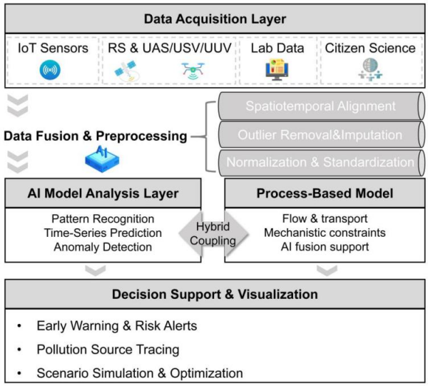 在全球城市化加速與氣候變化疊加影響下,水污染問題日趨嚴峻,傳統水質監測手段因響應滯后、覆蓋范圍有限和應對突發事件能力不足,已難以滿足當前水環境治理需求。人工智能(AI)技術的快速發展為解決這一問題提供了新路徑。中國科學院東北地理與農業生態研究所水環境健康與模擬學科組在綜述性研究中提出,通過整合AI與物聯網(IoT)、遙感(RS)及無人監測平臺(UMP)等技術,構建混合建模框架,有助于提升實時水質監測精度與效率,拓展數據獲取范圍,并實現多源異構數據的融合與智能分析。