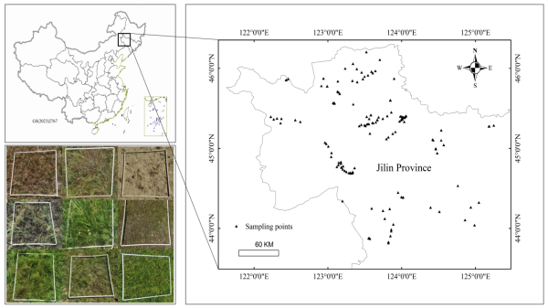 圖1 吉林省西部采樣點(diǎn)位置及典型樣方調(diào)查照片